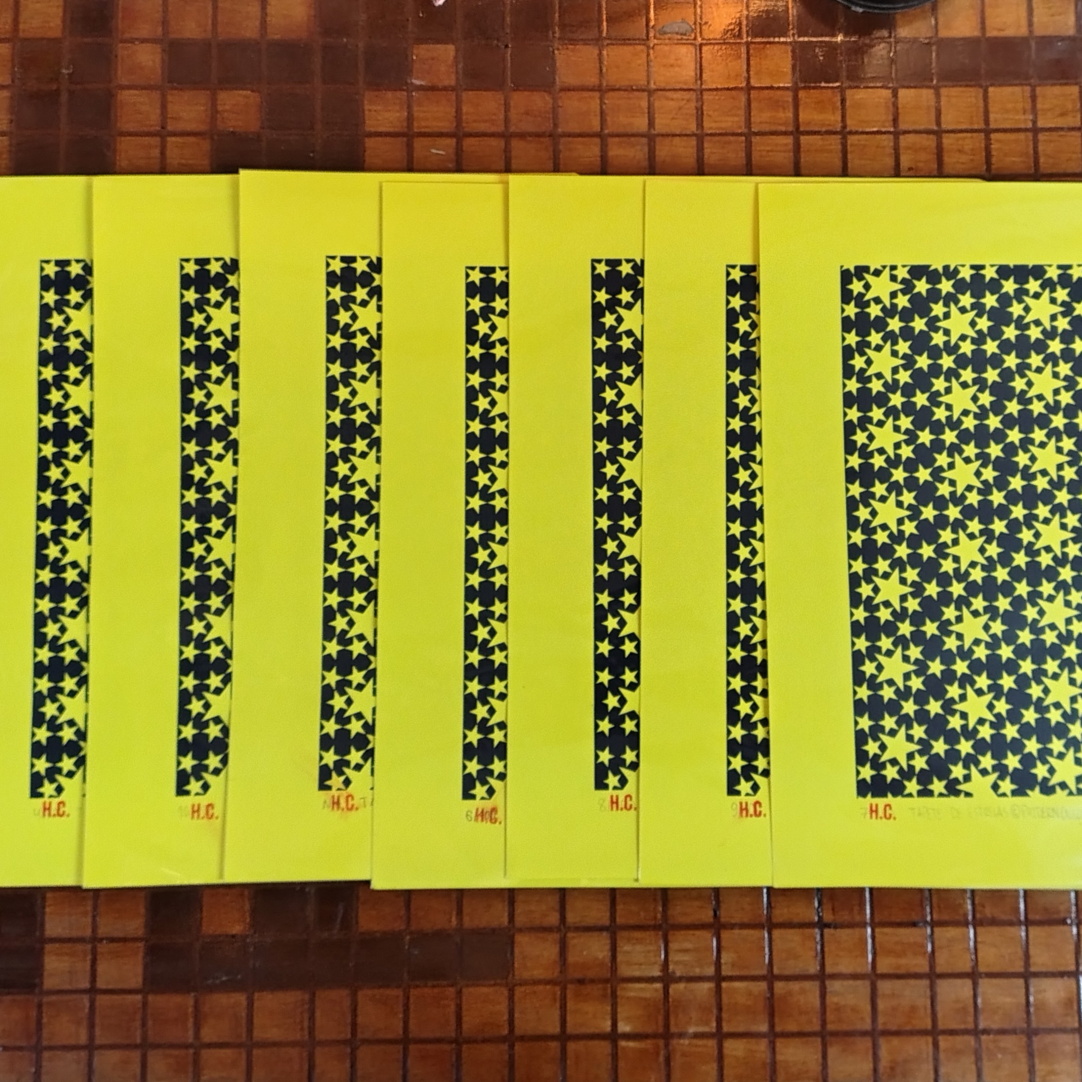 A Serigrafia ‘Tapete de Estrelas © Pattern – Neon’ apresenta um pedaço do padrão geométrico que compõe um recorte janela com vista para um céu estrelado de forma de cristalizada e simétrica, o padrão foi primeiramente elaborado em 2018 (data gravada no depósito de copyright) originado à partir de uma derivação do ‘Mosaico de Estrelas & Pentágonos’ inventado junto ao ‘Pyramids & Pentagons Pattern’. *Exposto à luz negra o Papel Neon ganha Efeito luminoso e brilha no escuro! Ideal para apreciar as estrelas!